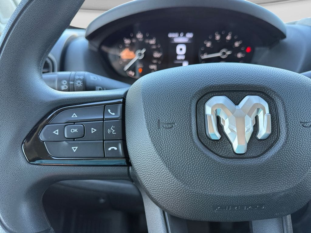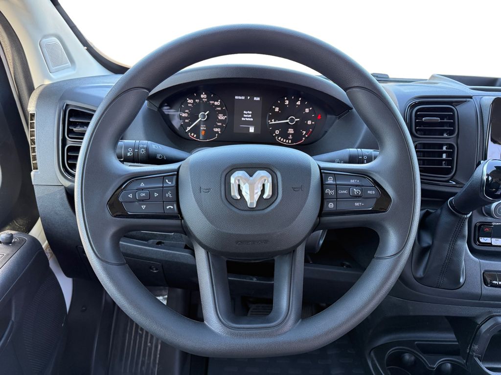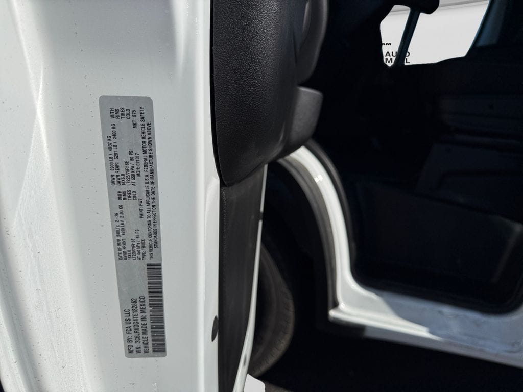 Convenience Group (Exterior Mirrors with Heating Element, Exterior Mirrors with Supplemental Signals, Front Fog Lamps, Power Adjust Mirrors, Power Folding/Heated Mirrors, Power-Adjustable Convex Aux Mirrors, Power-Folding Mirrors, and Rear Cargo LED Lamp), Power Group (100 Amp Battery, 115V Auxiliary Power Outlet, and 12V Rear Auxiliary Power Outlet), Quick Order Package 22B Tradesman (4-Way Manual Adjust Front Passenger Seat and Passenger Bucket Seat), 220 Amp Alternator, 4 Speakers, 4-Wheel Disc Brakes, 4.08 Axle Ratio, 4G LTE Wi-Fi Hotspot, ABS brakes, Adaptive Cruise Control with Stop and Go, Air Conditioning, AM/FM radio: SiriusXM, Apple CarPlay, Apple CarPlay/Android Auto, Black/Gray Seats, Bodyside moldings, Brake assist, Cargo Storage Headliner, Cloth Bucket Seats, Connectivity - US/Canada, Driver door bin, Driver Seat Armrest, Driver's Seat Mounted Armrest, Electronic Stability Control, For Details, Visit DriveUconnect.com, For More Info, Call 800-643-2112, Front anti-roll bar, Front Bucket Seats, Front License Plate Bracket, Front reading lights, Front wheel independent suspension, Global Telematics Box Module, Google Android Auto, GPS Antenna Input, Heavy Duty Suspension, Illuminated entry, Integrated Center Stack Radio, Low tire pressure warning, Manufacturer's Statement of Origin, MyFlexCare Service Plan, Outside temperature display, Overhead airbag, Overhead console, ParkView Rear Back-Up Camera, Passenger door bin, Power steering, Power windows, Radio: Uconnect 5 with 7" Display, Remote keyless entry, SiriusXM Radio Service, Steering wheel mounted audio controls, Tachometer, Telescoping steering wheel, Traction control, Trip computer, Turn signal indicator mirrors, Variably intermittent wipers, Wheel Center Cap, and Wheels: 16" x 6.0" SteeL.